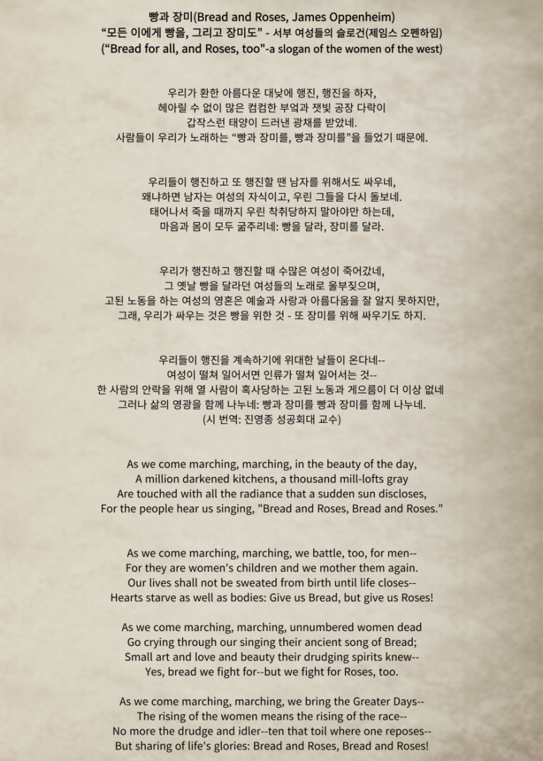 노동에 대한 제대로 된 대가를 의미하는 '빵'과 문화를 즐기는 삶을 의미하는 '장미'는 당시 로렌스 파업에서 여성 노동자가 “우리에게 빵을 달라, 장미를 달라”라고 쓰인 피켓을 들었다 하여 ‘빵과 장미 파업’이라는 명칭을 얻었다고 한다.